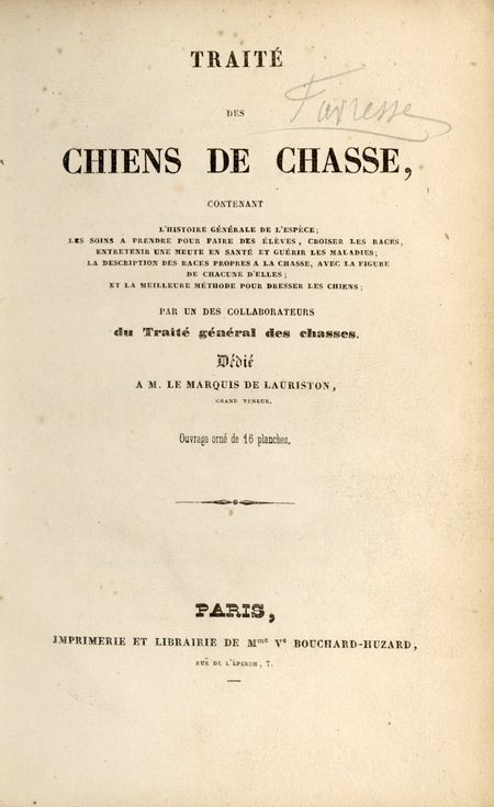 Traité des chiens de chasse, contenant l'histoire générale de l'espèce ; les soins à prendre pour faire des élèves, croiser les races, entretenir une meute en santé et guérir les maladies ; la description des races propres à la chasse, avec la figure de chacune d'elles ; et la meilleure méthode pour dresser les chiens