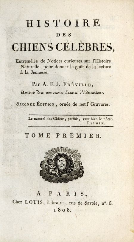 Histoire des chiens célèbres, entremêlée de notices curieuses sur l'Histoire naturelle, pour donner le goût de la lecture à la jeunesse. Tome premier