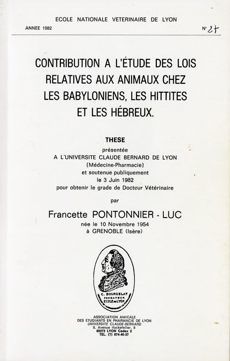 Contribution à l'étude des lois relatives aux animaux chez les Babyloniens, les Hittites et les Hébreux